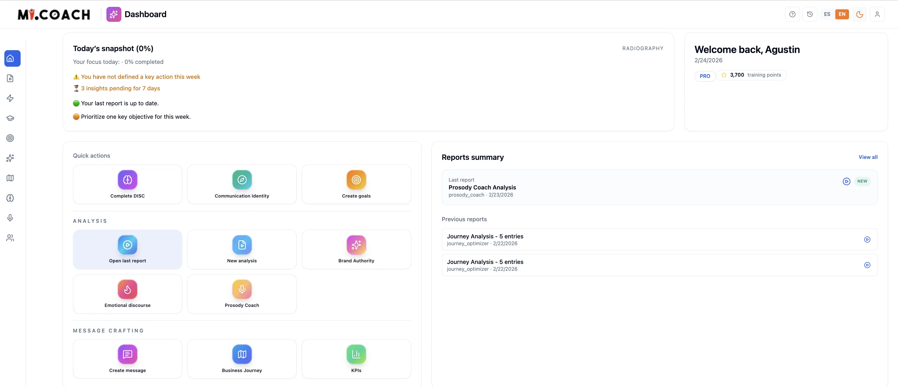 Mi.Coach is an AI-powered executive communication intelligence platform. Unlike traditional coaching, which relies on subjective human feedback, Mi.Coach analyzes real executive communications (board sessions, investor pitches, leadership calls) to deliver quantified behavioral insights on authority, influence, DISC profile, and strategic alignment — objectively measurable and continuously trackable.